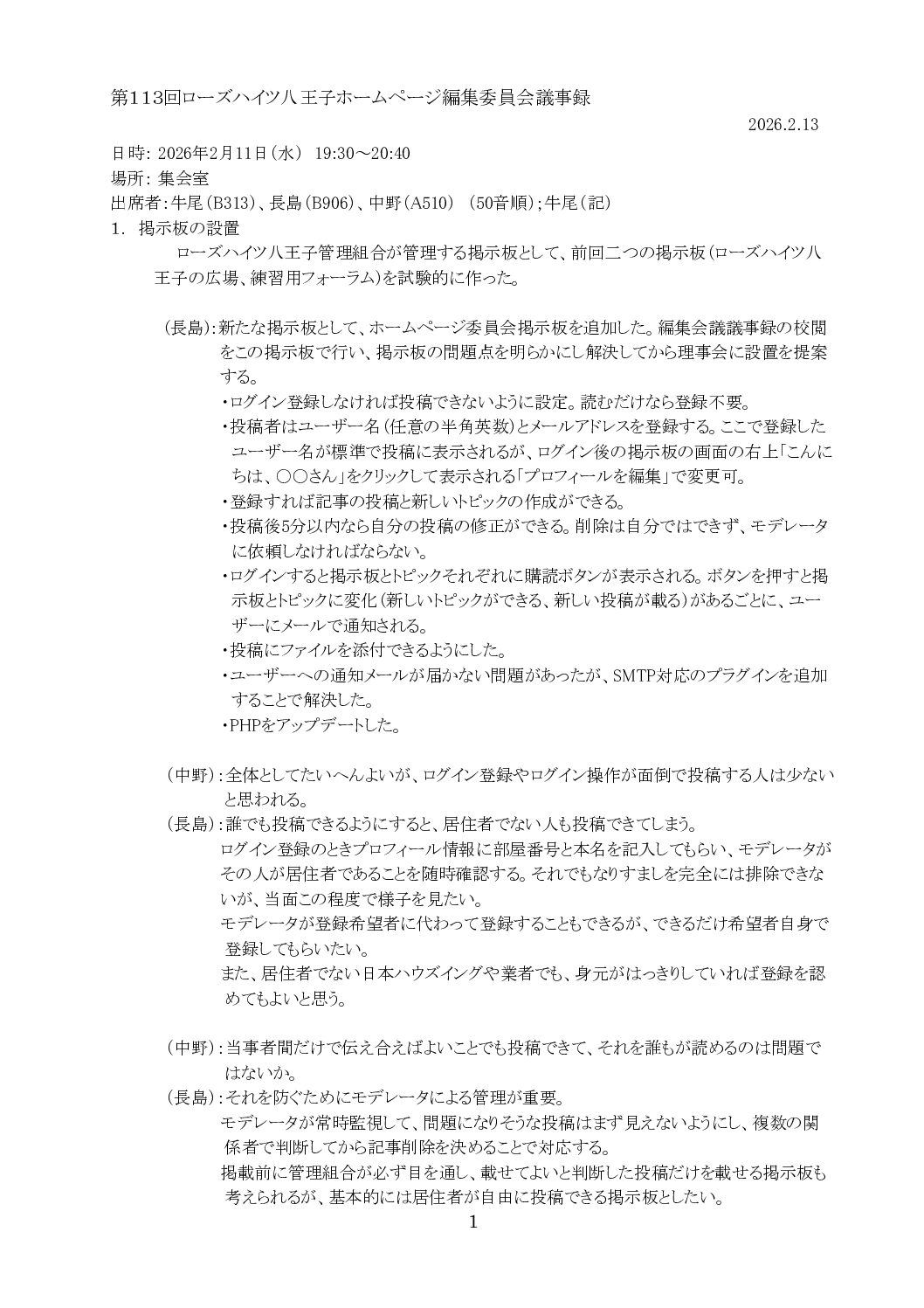 第113回ローズハイツ八王子ホームページ編集委員会議事録